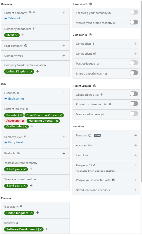 For the sake of Navigator, I can use: “Software Development” AND “Staffing and Recruiting”; I can also consider “IT Services and Consulting”, etc.